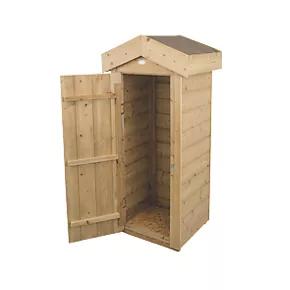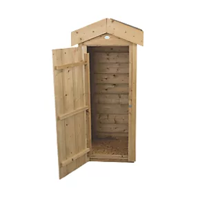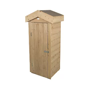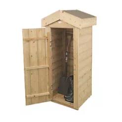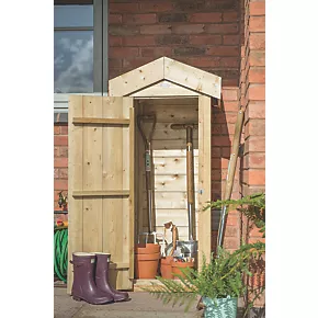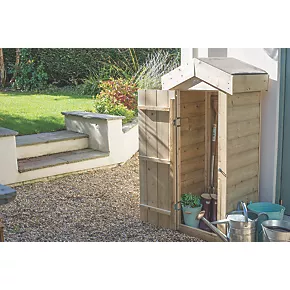 Compact garden store ideal for keeping small outdoor equipment. Made from smooth-planed interlocking shiplap tongue and groove boards with green mineral felted roof that keeps it weathertight. The floor is mounted on pressure-treated bearers to keep it off the ground and dry.