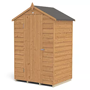 Compact shed, ideal for storing gardening equipment. Traditional apex roof, smooth-planed barge boards and decorative finial. Perfect for positioning against a wall or in a corner. Design features small sections, making it easier to handle and allows quick and easy assembly. Constructed with straight-cut boards that overlap to give flexibility, allowing natural movement of the timber during the changing seasons and to aid water run-off. The roof is made from hardwearing sheet material finished with black sand felt. Pressure-treated solid timber floor for strength, allowing for the storage of heavier items like lawnmowers or bags of compost. The shed door is braced with double ‘Z’ framing for rigidity and hung with secure hidden hinges. Fitted with a hasp and staple latch that can be padlocked (padlock not included). The lack of windows help to keep belongings hidden. The door can also be hinged either side of the opening to suit the garden. Manufactured in the UK and supplied with all fixtures, fittings and felt needed to build.
