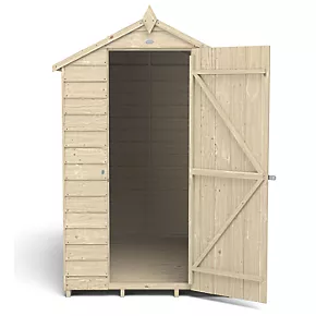 Compact shed, ideal for storing gardening equipment. Traditional apex roof, smooth-planed barge boards and decorative finial. Perfect for positioning against a wall or in a corner. Design features small sections, making it easier to handle and allows quick and easy assembly. Constructed with straight-cut boards that overlap to give flexibility, allowing natural movement of the timber during the changing seasons and to aid water run-off. The roof is made from hardwearing sheet material finished with black sand felt. Pressure-treated solid timber floor for strength, allowing for the storage of heavier items like lawnmowers or bags of compost. The shed door is braced with double ‘Z’ framing for rigidity and hung with secure hidden hinges. Fitted with a hasp and staple latch that can be padlocked (padlock not included). The lack of windows help to keep belongings hidden. The door can also be hinged either side of the opening to suit the garden. Manufactured in the UK and supplied with all fixtures, fittings and felt needed to build.