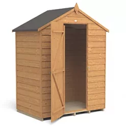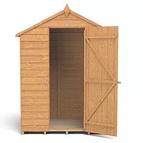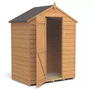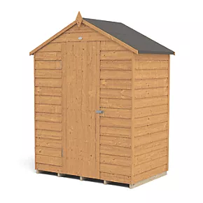 Compact shed, ideal for storing gardening equipment. Traditional apex roof, smooth-planed barge boards and decorative finial. Perfect for positioning against a wall or in a corner. Design features small sections, making it easier to handle and allows quick and easy assembly. Constructed with straight-cut boards that overlap to give flexibility, allowing natural movement of the timber during the changing seasons and to aid water run-off. The roof is made from hardwearing sheet material finished with black sand felt. Pressure-treated solid timber floor for strength, allowing for the storage of heavier items like lawnmowers or bags of compost. The shed door is braced with double ‘Z’ framing for rigidity and hung with secure hidden hinges. Fitted with a hasp and staple latch that can be padlocked (padlock not included). The lack of windows help to keep belongings hidden. The door can also be hinged either side of the opening to suit the garden. Manufactured in the UK and supplied with all fixtures, fittings and felt needed to build.
