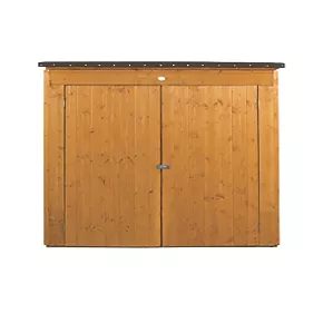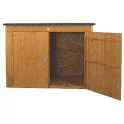 Large outdoor store ideal for storing lawnmowers and other large garden equipment. Made from traditional dip-treated overlap panels, this versatile unit is mounted on pressure treated bearers to prevent damage from standing water. Double doors offer easy access and pent roof can be assembled sloping back or forward depending on preference or position.