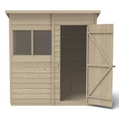 A great storage solution for all types of gardening equipment, from tools to lawnmowers. Pent roof and windows allow plenty of room and light. Roof style is perfect for situating against a back wall or fence. Design features small sections, making it easier to handle and quick and easy to assemble. Overlapped, straight-cut boards allowing for natural movement of the timber so it can adapt to the changing weather conditions and ensure rainwater run-off. Pressure-treated solid timber floor allows for the storage of heavier items like lawnmowers or bags of compost. The shed door is braced with double ‘Z’ framing for rigidity and is hung with secure hidden hinges. Fitted with a hasp and staple latch that can be padlocked (padlock not included). The 2 fixed windows are made from shatterproof PET glazing, which will not yellow or brittle over time. The door can also be hinged either side of the opening to suit the garden. The dip treatment that has been applied at the factory protects the timber (annual treatment required). Manufactured in the UK and supplied with felt and all fixtures and fittings needed to build.