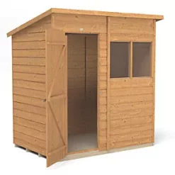 A great storage solution for all types of gardening equipment, from tools to lawnmowers. Pent roof and windows allow plenty of room and light. Roof style is perfect for situating against a back wall or fence. Design features small sections, making it easier to handle and quick and easy to assemble. Overlapped, straight-cut boards allowing for natural movement of the timber so it can adapt to the changing weather conditions and ensure rainwater run-off. Pressure-treated solid timber floor allows for the storage of heavier items like lawnmowers or bags of compost. The shed door is braced with double ‘Z’ framing for rigidity and is hung with secure hidden hinges. Fitted with a hasp and staple latch that can be padlocked (padlock not included). The 2 fixed windows are made from shatterproof PET glazing, which will not yellow or brittle over time. The door can also be hinged either side of the opening to suit the garden. The dip treatment that has been applied at the factory protects the timber (annual treatment required). Manufactured in the UK and supplied with felt and all fixtures and fittings needed to build.