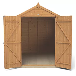 A great storage solution for all types of gardening equipment, from bikes to lawnmowers. The double doors and increased headroom ensure easy access and plenty of room to move around. Design features small sections, making it easier to handle and easy to assemble. The straight-cut boards are overlapped, allowing for natural movement of the timber so it can adapt to the changing weather and aid rainwater run-off. The doors are braced with strong double ‘Z’ framing, have secure hidden hinges and are fitted with a hasp and staple latch that can be used with a padlock. Pressure-treated solid timber floor allows for the storage of heavier items, shelving or a workbench. The 2 fixed windows are made from shatterproof PET glazing, which will not become yellow or brittle over time. This flexible shed is made up of modular sections where same size panels are interchangeable, this also allows choice of which side the window panel goes during assembly, or move the window panel forward or backwards. The roof is made from hardwearing sheet material finished with black sand felt. The dip treatment that has been applied at the factory protects the timber from rot and fungal decay. Manufactured in the UK and supplied with all fixtures, fittings and felt needed to build.