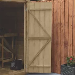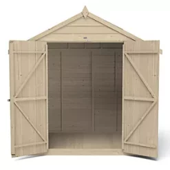 Keeps the garden clutter-free and offers a secure space for storing garden equipment. High apex for plenty of headroom inside. Design features small sections, making it easier to handle and quick and easy to assemble. Pressure-treated solid timber floor allows for the storage of heavier items like lawnmowers or bags of compost. The straight-cut boards are overlapped, allowing for natural movement of the timber so it can adapt to the changing weather conditions and ensure rainwater run-off. The roof is made from hardwearing sheet material with black sand felt and is finished with smooth-planed barge boards and decorative finial. The fixed window is made from shatterproof PET glazing, which will not become yellow or brittle over time. This flexible shed is made up of modular sections where same size panels are interchangeable, this also allows choice of which side the window panel goes during assembly, or move the window panel forward or backwards. The double doors are braced with strong double ‘Z’ framing for rigidity. They feature hidden hinges and can be secured with the hasp and staple latch for increased security (padlock not included). The dip treatment that has been applied protects the timber from rot and fungal decay. Manufactured in the UK and supplied with all fixtures, fittings and felt needed to build.