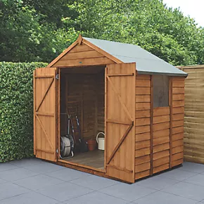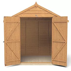 Keeps the garden clutter-free and offers a secure space for storing garden equipment. High apex for plenty of headroom inside. Design features small sections, making it easier to handle and quick and easy to assemble. Pressure-treated solid timber floor allows for the storage of heavier items like lawnmowers or bags of compost. The straight-cut boards are overlapped, allowing for natural movement of the timber so it can adapt to the changing weather conditions and ensure rainwater run-off. The roof is made from hardwearing sheet material with black sand felt and is finished with smooth-planed barge boards and decorative finial. The fixed window is made from shatterproof PET glazing, which will not become yellow or brittle over time. This flexible shed is made up of modular sections where same size panels are interchangeable, this also allows choice of which side the window panel goes during assembly, or move the window panel forward or backwards. The double doors are braced with strong double ‘Z’ framing for rigidity. They feature hidden hinges and can be secured with the hasp and staple latch for increased security (padlock not included). The dip treatment that has been applied protects the timber from rot and fungal decay. Manufactured in the UK and supplied with all fixtures, fittings and felt needed to build.