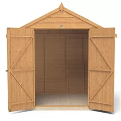 Keeps the garden clutter-free and offers a secure space for storing garden equipment. High apex for plenty of headroom inside. Design features small sections, making it easier to handle and quick and easy to assemble. Pressure-treated solid timber floor allows for the storage of heavier items like lawnmowers or bags of compost. The straight-cut boards are overlapped, allowing for natural movement of the timber so it can adapt to the changing weather conditions and ensure rainwater run-off. The roof is made from hardwearing sheet material with black sand felt and is finished with smooth-planed barge boards and decorative finial. The fixed window is made from shatterproof PET glazing, which will not become yellow or brittle over time. This flexible shed is made up of modular sections where same size panels are interchangeable, this also allows choice of which side the window panel goes during assembly, or move the window panel forward or backwards. The double doors are braced with strong double ‘Z’ framing for rigidity. They feature hidden hinges and can be secured with the hasp and staple latch for increased security (padlock not included). The dip treatment that has been applied protects the timber from rot and fungal decay. Manufactured in the UK and supplied with all fixtures, fittings and felt needed to build.