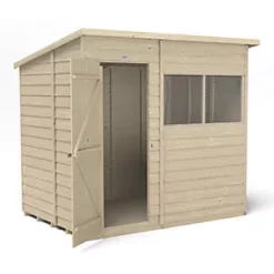 Pent roof creates more room at the front, ideal for general storage where space in the garden is limited. Its 2 fixed windows allow plenty of light in and makes it an ideal potting shed. Design features small sections, making it easier to handle and easy to assemble. Features additional framing for a strong construction. Includes a strong braced double ‘Z’ framed door with secure hidden hinges and a hasp and staple latch. The door can be hinged either side and the latch secured with a padlock (not supplied). The roof is made from hardwearing sheet material completed with black sand felt. The 2 fixed windows, made from shatterproof PET glazing, which will not become yellow or brittle over time. Pressure-treated solid timber floor allows for the storage of heavier items like lawnmowers or bags of compost. Manufactured from straight-cut timber boards that overlap to help rainwater run-off. The overlapping boards give flexibility, allowing for natural movement in changing weather conditions. The timber is dip-treated, protecting against rot (annual retreatment is required). Manufactured in the UK and supplied with all fixtures, fittings and felt needed to build.