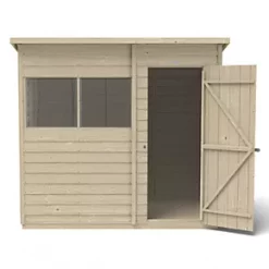 Pent roof creates more room at the front, ideal for general storage where space in the garden is limited. Its 2 fixed windows allow plenty of light in and makes it an ideal potting shed. Design features small sections, making it easier to handle and easy to assemble. Features additional framing for a strong construction. Includes a strong braced double ‘Z’ framed door with secure hidden hinges and a hasp and staple latch. The door can be hinged either side and the latch secured with a padlock (not supplied). The roof is made from hardwearing sheet material completed with black sand felt. The 2 fixed windows, made from shatterproof PET glazing, which will not become yellow or brittle over time. Pressure-treated solid timber floor allows for the storage of heavier items like lawnmowers or bags of compost. Manufactured from straight-cut timber boards that overlap to help rainwater run-off. The overlapping boards give flexibility, allowing for natural movement in changing weather conditions. The timber is dip-treated, protecting against rot (annual retreatment is required). Manufactured in the UK and supplied with all fixtures, fittings and felt needed to build.