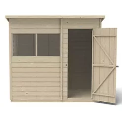 Pent roof creates more room at the front, ideal for general storage where space in the garden is limited. Its 2 fixed windows allow plenty of light in and makes it an ideal potting shed. Design features small sections, making it easier to handle and easy to assemble. Features additional framing for a strong construction. Includes a strong braced double ‘Z’ framed door with secure hidden hinges and a hasp and staple latch. The door can be hinged either side and the latch secured with a padlock (not supplied). The roof is made from hardwearing sheet material completed with black sand felt. The 2 fixed windows, made from shatterproof PET glazing, which will not become yellow or brittle over time. Pressure-treated solid timber floor allows for the storage of heavier items like lawnmowers or bags of compost. Manufactured from straight-cut timber boards that overlap to help rainwater run-off. The overlapping boards give flexibility, allowing for natural movement in changing weather conditions. The timber is dip-treated, protecting against rot (annual retreatment is required). Manufactured in the UK and supplied with all fixtures, fittings and felt needed to build.