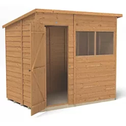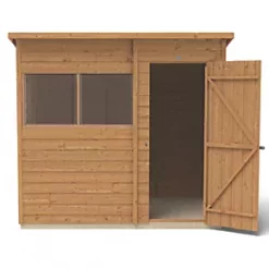 Pent roof creates more room at the front, ideal for general storage where space in the garden is limited. Its 2 fixed windows allow plenty of light in and makes it an ideal potting shed. Design features small sections, making it easier to handle and easy to assemble. Features additional framing for a strong construction. Includes a strong braced double ‘Z’ framed door with secure hidden hinges and a hasp and staple latch. The door can be hinged either side and the latch secured with a padlock (not supplied). The roof is made from hardwearing sheet material completed with black sand felt. The 2 fixed windows, made from shatterproof PET glazing, which will not become yellow or brittle over time. Pressure-treated solid timber floor allows for the storage of heavier items like lawnmowers or bags of compost. Manufactured from straight-cut timber boards that overlap to help rainwater run-off. The overlapping boards give flexibility, allowing for natural movement in changing weather conditions. The timber is dip-treated, protecting against rot (annual retreatment is required). Manufactured in the UK and supplied with all fixtures, fittings and felt needed to build.