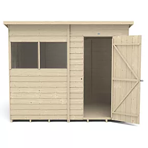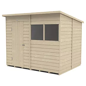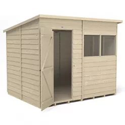 Great for general storage, the pent roof gives increased headroom at the front, with 2 fixed windows to allow extra light in, making it ideal as a potting shed. Design features small sections, making it easier to handle and easy to assemble. Designed with strength and security in mind, with increased framing and a strong braced double ‘Z’ framed door. The door has secure hidden hinges and is fitted with a hasp and staple latch which can be locked with a padlock (not included). It can be hinged either side. The 2 fixed windows are made from shatterproof PET glazing, which will not become yellow or brittle over time. The straight-cut boards have an overlap construction which allows natural movement of the timber so it can adapt to changing weather conditions and ensure rainwater run-off. The roof is made from hardwearing sheet material and is finished with black sand felt. Pressure-treated solid timber floor allows for the storage of heavier items like lawnmowers, bags of compost or a potting bench. Manufactured in the UK and supplied with all fixtures, fittings and felt needed to build.