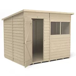 Great for general storage, the pent roof gives increased headroom at the front, with 2 fixed windows to allow extra light in, making it ideal as a potting shed. Design features small sections, making it easier to handle and easy to assemble. Designed with strength and security in mind, with increased framing and a strong braced double ‘Z’ framed door. The door has secure hidden hinges and is fitted with a hasp and staple latch which can be locked with a padlock (not included). It can be hinged either side. The 2 fixed windows are made from shatterproof PET glazing, which will not become yellow or brittle over time. The straight-cut boards have an overlap construction which allows natural movement of the timber so it can adapt to changing weather conditions and ensure rainwater run-off. The roof is made from hardwearing sheet material and is finished with black sand felt. Pressure-treated solid timber floor allows for the storage of heavier items like lawnmowers, bags of compost or a potting bench. Manufactured in the UK and supplied with all fixtures, fittings and felt needed to build.