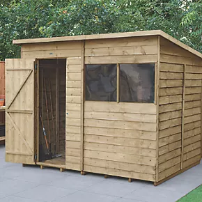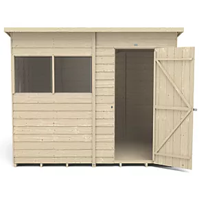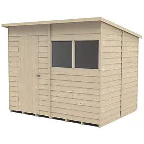 Great for general storage, the pent roof gives increased headroom at the front, with 2 fixed windows to allow extra light in, making it ideal as a potting shed. Design features small sections, making it easier to handle and easy to assemble. Designed with strength and security in mind, with increased framing and a strong braced double ‘Z’ framed door. The door has secure hidden hinges and is fitted with a hasp and staple latch which can be locked with a padlock (not included). It can be hinged either side. The 2 fixed windows are made from shatterproof PET glazing, which will not become yellow or brittle over time. The straight-cut boards have an overlap construction which allows natural movement of the timber so it can adapt to changing weather conditions and ensure rainwater run-off. The roof is made from hardwearing sheet material and is finished with black sand felt. Pressure-treated solid timber floor allows for the storage of heavier items like lawnmowers, bags of compost or a potting bench. Manufactured in the UK and supplied with all fixtures, fittings and felt needed to build.