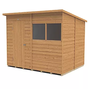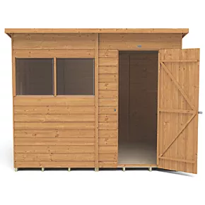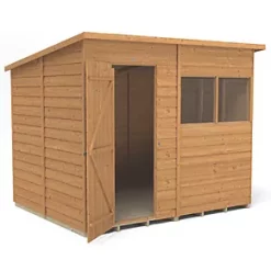 Great for general storage, the pent roof gives increased headroom at the front, with 2 fixed windows to allow extra light in, making it ideal as a potting shed. Design features small sections, making it easier to handle and easy to assemble. Designed with strength and security in mind, with increased framing and a strong braced double ‘Z’ framed door. The door has secure hidden hinges and is fitted with a hasp and staple latch which can be locked with a padlock (not included). It can be hinged either side. The 2 fixed windows are made from shatterproof PET glazing, which will not become yellow or brittle over time. The straight-cut boards have an overlap construction which allows natural movement of the timber so it can adapt to changing weather conditions and ensure rainwater run-off. The roof is made from hardwearing sheet material and is finished with black sand felt. Pressure-treated solid timber floor allows for the storage of heavier items like lawnmowers, bags of compost or a potting bench. Manufactured in the UK and supplied with all fixtures, fittings and felt needed to build.