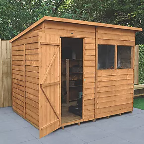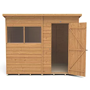 Great for general storage, the pent roof gives increased headroom at the front, with 2 fixed windows to allow extra light in, making it ideal as a potting shed. Design features small sections, making it easier to handle and easy to assemble. Designed with strength and security in mind, with increased framing and a strong braced double ‘Z’ framed door. The door has secure hidden hinges and is fitted with a hasp and staple latch which can be locked with a padlock (not included). It can be hinged either side. The 2 fixed windows are made from shatterproof PET glazing, which will not become yellow or brittle over time. The straight-cut boards have an overlap construction which allows natural movement of the timber so it can adapt to changing weather conditions and ensure rainwater run-off. The roof is made from hardwearing sheet material and is finished with black sand felt. Pressure-treated solid timber floor allows for the storage of heavier items like lawnmowers, bags of compost or a potting bench. Manufactured in the UK and supplied with all fixtures, fittings and felt needed to build.