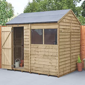 Reverse apex roof with increased headroom means the interior space can be used to its greatest storage potential whilst the windows let in plenty of light. Design features small sections, making it easier to handle and easy to assemble. The door has secure hidden hinges and is fitted with a hasp and staple latch which can be locked with a padlock (not included). Made up of modular sections where same size panels are interchangeable, this allows choice of where the window panel goes during assembly and the door can be hung to the left or the right. The 2 fixed windows are made from shatterproof PET glazing, which will not become yellow or brittle over time. The straight-cut boards have an overlap construction which allows natural movement of the timber so it can adapt to changing weather conditions and ensure rainwater run-off. The roof is made from hardwearing sheet material and is finished with black sand felt. Pressure-treated solid timber floor allows for the storage of heavier items like lawnmowers, bags of compost or a potting bench. Manufactured in the UK and supplied with all fixtures, fittings and felt needed to build.