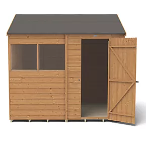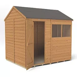 Reverse apex roof with increased headroom means the interior space can be used to its greatest storage potential whilst the windows let in plenty of light. Design features small sections, making it easier to handle and easy to assemble. The door has secure hidden hinges and is fitted with a hasp and staple latch which can be locked with a padlock (not included). Made up of modular sections where same size panels are interchangeable, this allows choice of where the window panel goes during assembly and the door can be hung to the left or the right. The 2 fixed windows are made from shatterproof PET glazing, which will not become yellow or brittle over time. The straight-cut boards have an overlap construction which allows natural movement of the timber so it can adapt to changing weather conditions and ensure rainwater run-off. The roof is made from hardwearing sheet material and is finished with black sand felt. Pressure-treated solid timber floor allows for the storage of heavier items like lawnmowers, bags of compost or a potting bench. Manufactured in the UK and supplied with all fixtures, fittings and felt needed to build.