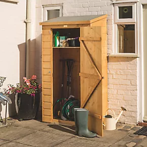 Lockable midi store, ideal for smaller gardens or patios. Provides a convenient storage solution and features a handy shelf. Supplied dip-treated in honey brown.