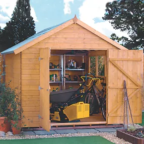Traditional garden shed with dipped honey brown finish. Apex roof made from solid sheet OSB and covered with mineral roofing felt. Features double lockable doors which are secured with a padbolt. Supplied with 3 fixed windows.