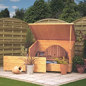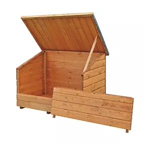 Ideal for storing garden tools and supplies. Features lifting lid with stay and removable front for easy access. Solid board floor and roof. Dipped honey brown finish.