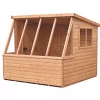 Extra strength shed with strong piano-hinged double doors. High ridge and eaves, plus tongue and groove walls, roof and floor. Northern hemisphere pine and spruce.