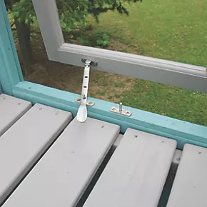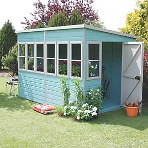 Ideal for use as a potting shed, workshop, hobby room or summerhouse. Features 6 fixed windows to the front and an opening window in each end. Also fitted with full length workbench and air vents.