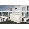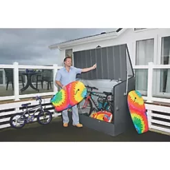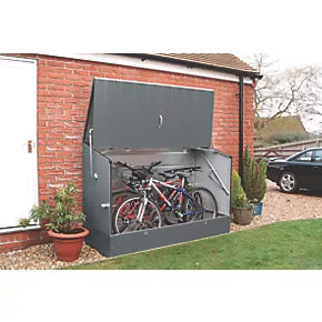 Outdoor bicycle store for the secure, safe and tidy storage of up to 3 adult bikes. Features spring-assisted opening action for complete accessibility and 2 padlock points, protecting bicycles from both weather and thieves. Designed to be bolted down onto a hard (concrete) surface from the inside and manufactured in the UK from PVC-coated galvanised steel, offering fire-resistance and no maintenance required. Suitable for most types of racing, mountain, hybrid or childrens cycles. Supplied with galvanised metal floor.