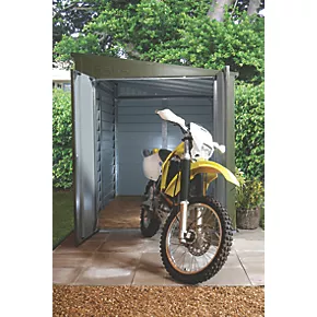 Security package for keeping a motorbike completely enclosed and out of sight. Includes heavy duty ground anchor and 1.5m chain with padlock for securing the motorcycle inside the garage. Features stainless steel hasp and padlock for front doors in addition to standard bolting system and battery-operated PIR alarm. All external bolts fitted with lock nuts to prevent panels being removed from outside.